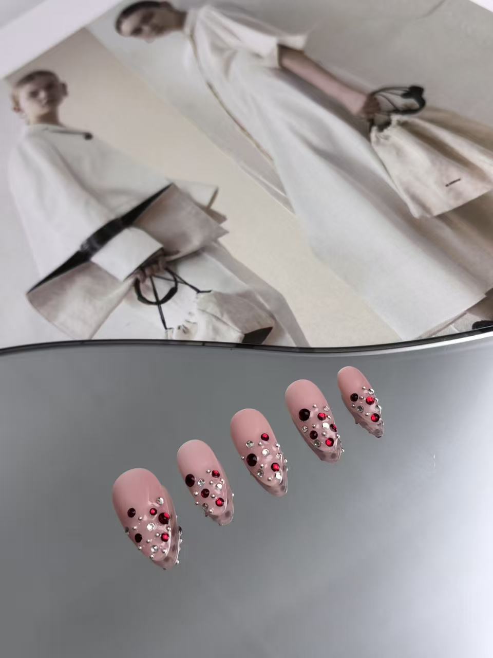 Soft blush pink almond nails adorned with ruby and crystal details.